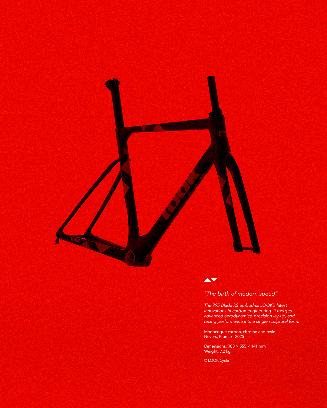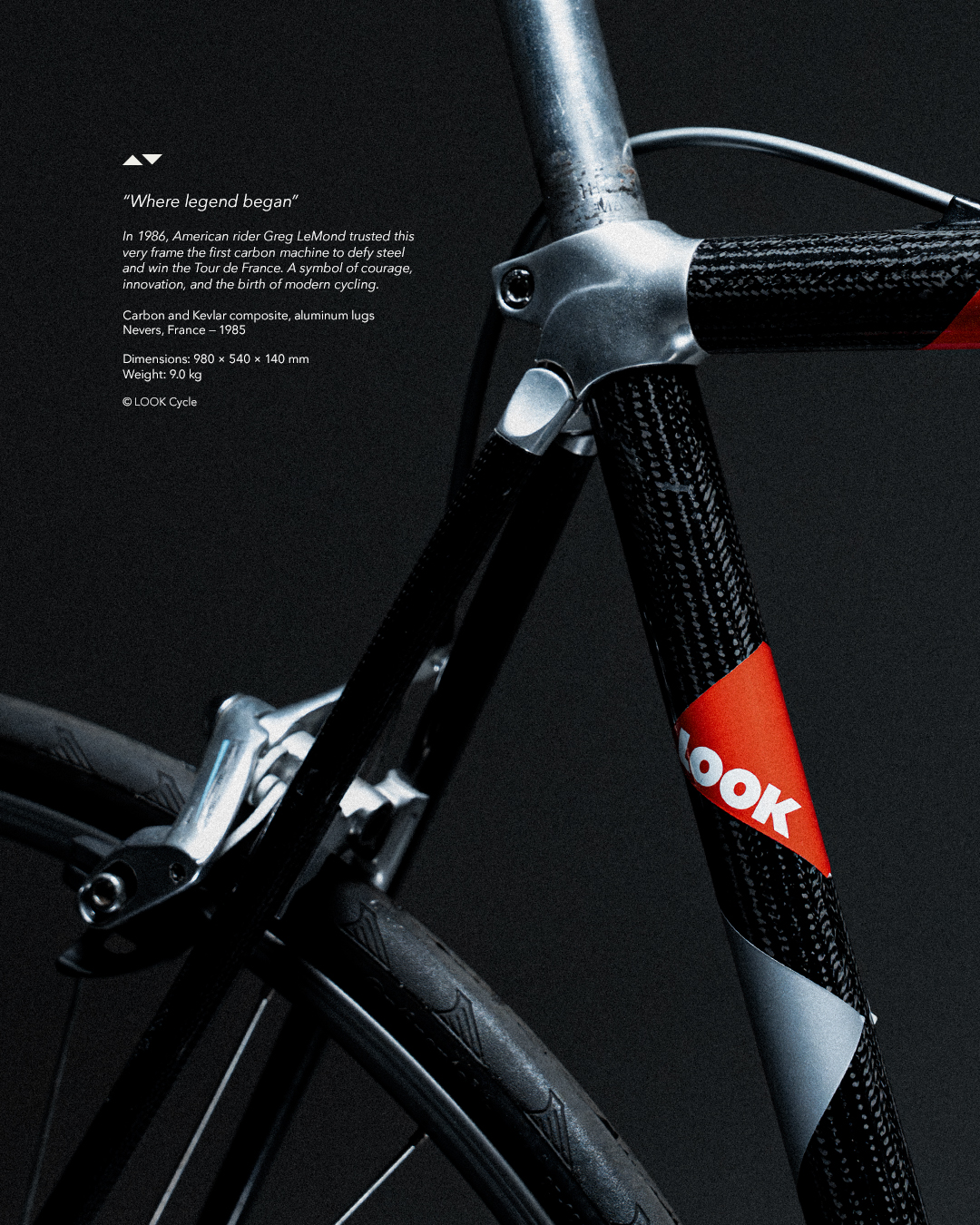 On the occasion of the 40th anniversary of the first carbon bike in history, launched by LOOK on the 1986 Tour de France, we celebrate the brand’s founding duality: iconic heritage and modern performance. A museum-like language: the KG86 as a historical piece, the 795 Blade RS KG Edition as its contemporary heir. Two eras in dialogue.